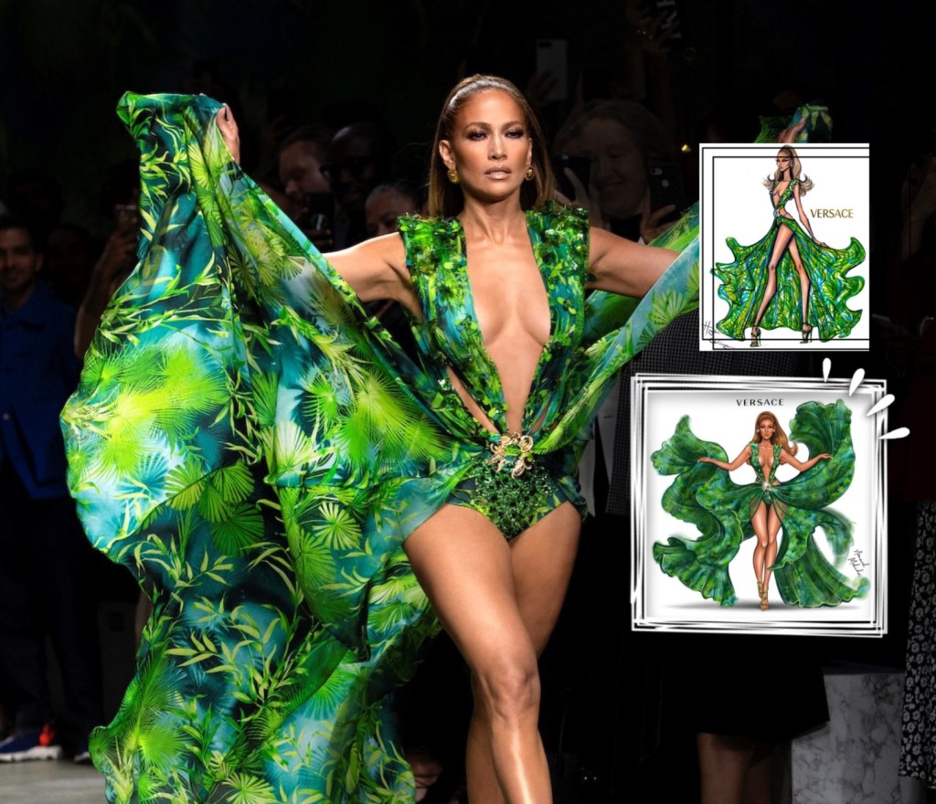 It was created by Audrey Versacei and has been referred to as “jungle green,” “sea green,” or “tropical” green. It is a green garment with hints of blue to give it an exotic aspect. The dress is made of translucent silk chiffon with a crotch studded with citrines and a tropical leaf and bamboo motif. The dress “had a low-cut neck that reached several inches beyond her navel, where it was loosely tied with a glittery brooch and then opened out again,” revealing her stomach. It was then cut along the front of the legs like a bathrobe, and it drooped behind her on the floor, open at the back.